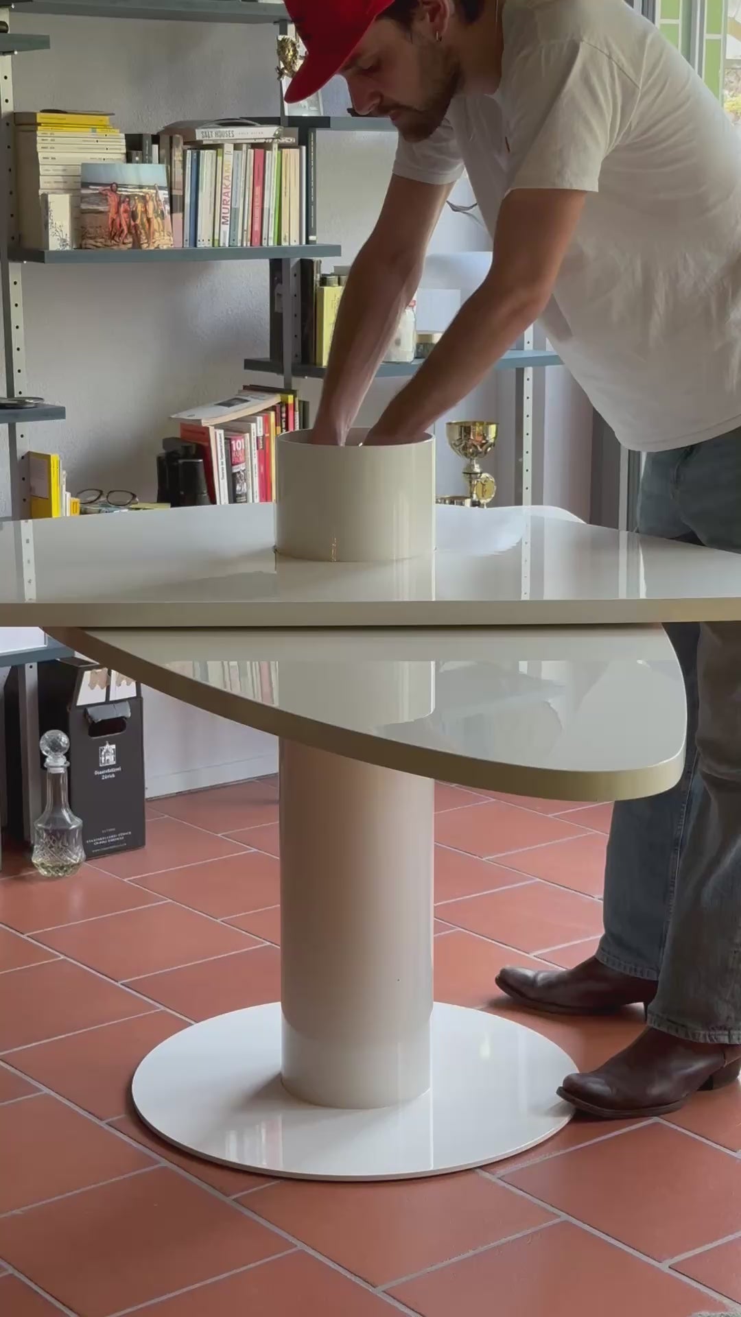 The construction of the FLIA Milano is based on a central steel pipe that passes through two tabletops, forming the table’s stable base. A mechanism developed by Valentino Scussel allows the two tabletops to rotate independently around the central steel pipe. By rotating the tabletops, the shape and size of the table surface change: depending on the degree of overlap, more or less surface area is created, allowing the table to adapt flexibly to different situations. This makes FLIA Milano a transformable table – suitable for everyday use, shared meals, or as a versatile object in both living and working spaces.